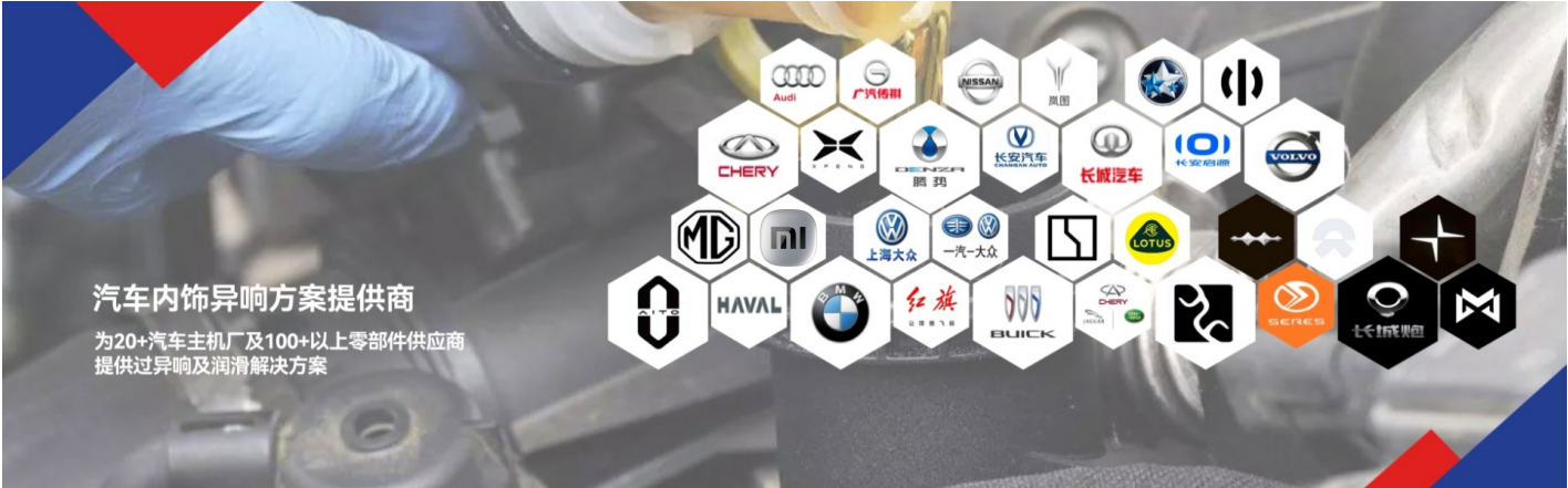 10年以上关于汽车行业相关的工作经验,曾至少为30家汽车主机厂及100家零部件供 应商提供过润滑解决方案。作为汽车异响与润滑方案解决商,五德玛长期与国内各主流主机厂NVH及研发人员保持良好交流互动。包括比亚迪,长城,小米,赛力斯,福特,日产,长安,广汽,金康,东风,理想,小鹏等一大批知名品牌主机厂,以及优秀的零部件制造商