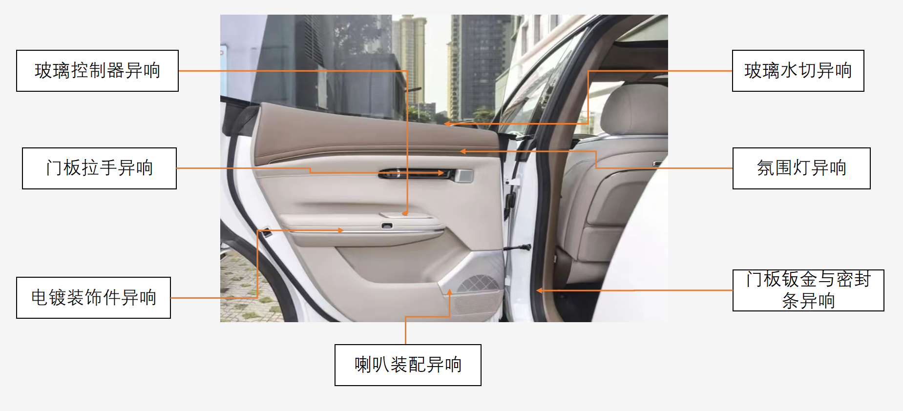 车门内饰板是不同装饰件和功能部件高度集合的位置,也是产生摩擦异响较多的三大内饰部件之一,来自车门部件的异响是电动车异响Top3之一。对包覆层皮革材料进行消音降噪主要的手段就是采用干膜型润滑剂,既起到消除异响的效果,又对皮革材料的表面和外观没有任何影响。