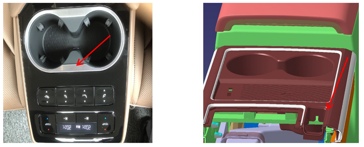 1:杯托电镀饰条与塑胶件装配时的按压异响;